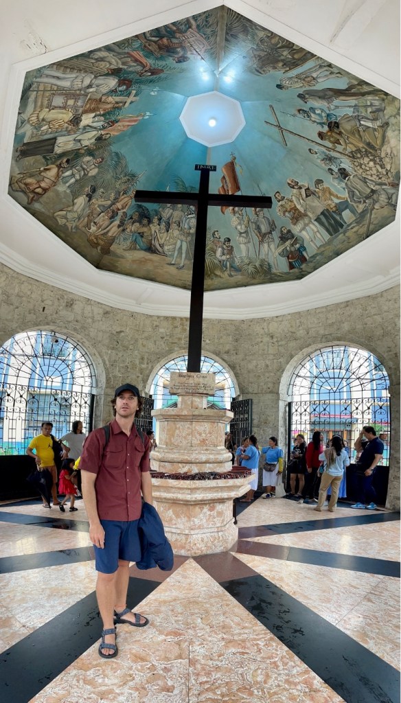 En el centro de la plaza, en un templete decorado con pinturas que nos narran la historia, una enorme cruz de madera se alza: es la Cruz de Magallanes. Esta cruz fue entregada por Fernando de Magallanes el 21 de abril de 1521 cuando arribaron a la isla.