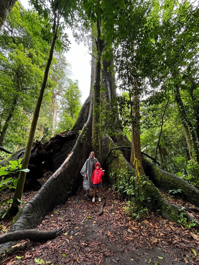Aunque el día se ha levantado nublado y no llegamos a ver el volcán completamente despejado, las vistas de las coladas y los caminos, metiéndose a través de la selva, están muy chulos, ¡en uno de ellos hasta vemos un árbol que tiene más de 600 años!
