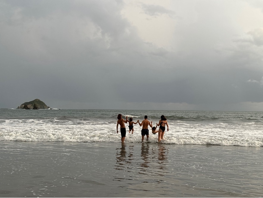 Aquí paramos un rato, nos bañamos, jugamos en la arena y hasta construimos una tortuga enorme que una ola se acaba llevando y que también empapa todas nuestras toallas y mochilas.