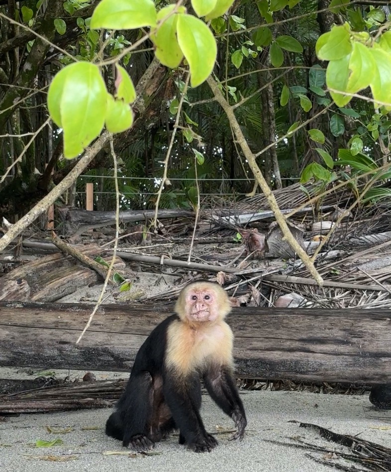 Después de un ratillo nos cruzamos a la playa de enfrente, la de Manuel Antonio, mucho más pequeñita y tranquila que la de Espadilla. Aquí algún mono se atreve a bajar de las ramas y acercarse a las bolsas que la gente ha dejado en la orilla mientras se bañan en busca de algo de comida.