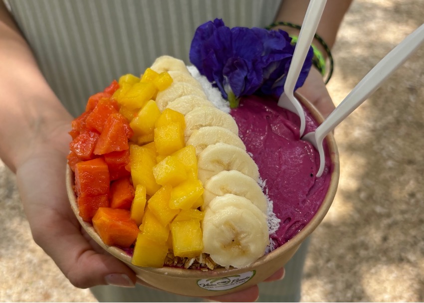 El mercadillo es muy chulo también, con puestecitos de ropa y de comida, leche fresca y verduras recién traídas… pero vaya precios. Se nota que esta zona está llena de gringos. Aun así, Maka se pide un bowl de açai con frutas que tiene un auténtico pintón.