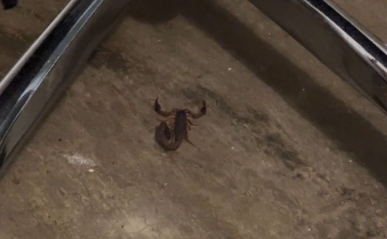 Volvemos a casa a poner una lavadora con la ropa sucia de estos días y preparar la mochila para mañana cuando, de repente, alado del pie de Carlos, me doy cuenta de que hay algo. Es un animal, pero no una araña como las que hemos visto estos días. Es marrón. Cuando caigo en lo que es… le digo tranquilamente a Carlos que venga un momento conmigo y se separe lentamente, sin darse cuenta, del escorpión que hay en el suelo.