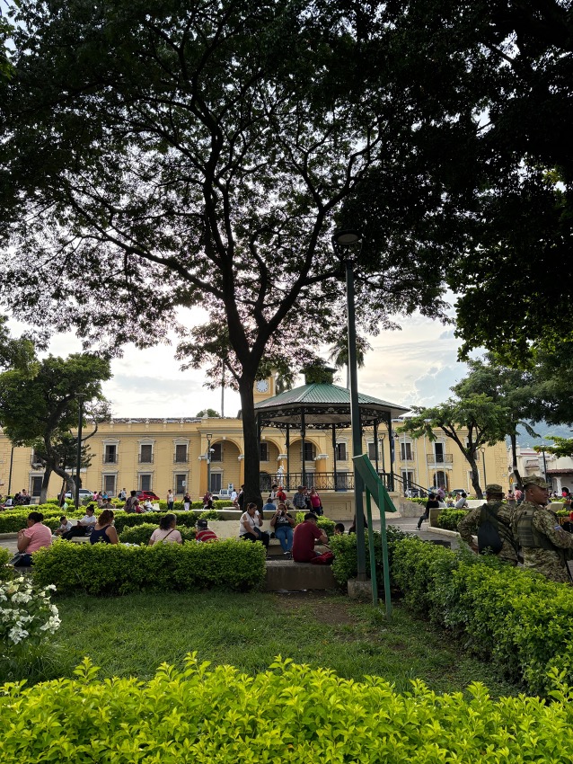 El Salvador es también famoso por su café. Y toda esta zona es cafetera, así que buscamos en la plaza un sitio donde tomarnos un cafecito y disfrutar del ambiente.