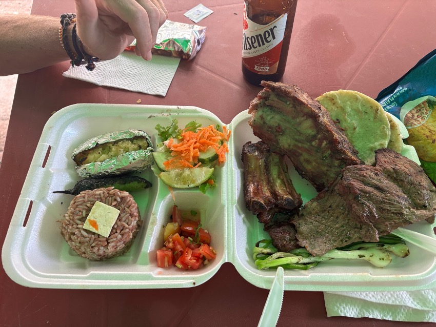 En la plaza central tienen un mercado circular donde comer algo y comprar recuerdos. Aquí elegimos una carne a la barbacoa con arroz y patatas que está de rechupete.