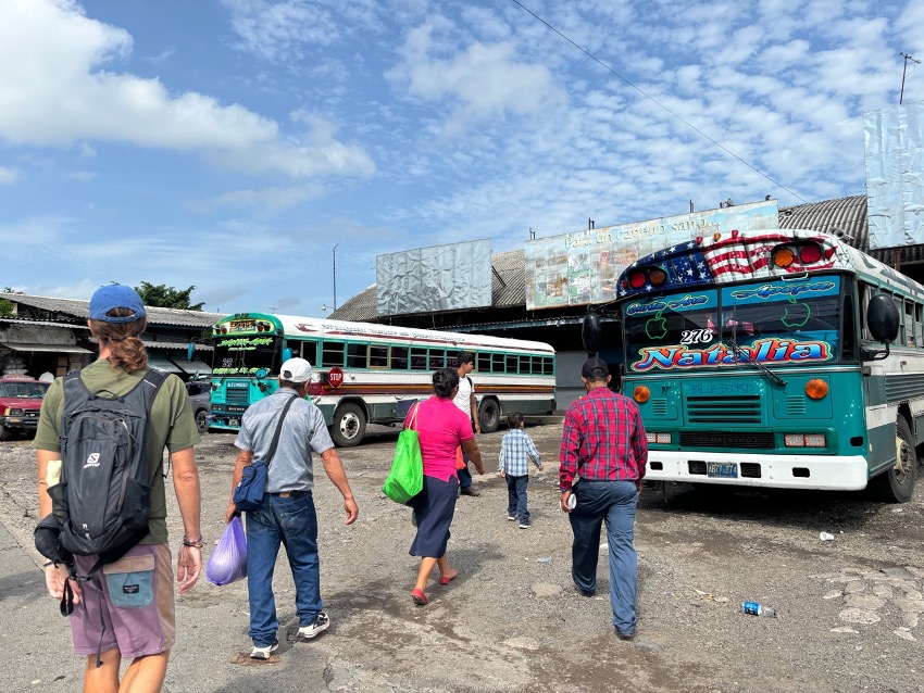Al día siguiente, volvemos a ir andando a la estación de autobuses y cogemos la Ruta-328 (que cuesta 80 céntimos y hace Santa Ana-Juayua). Cogemos uno que sale a las 10 de la mañana y sabemos que hay otro que sale más pronto, sobre las 07:15 aproximadamente, pero bien puede salir 15 minutos antes o 15 después. Para volver, preguntamos y nos dicen que el último es a las 4 de la tarde así que tenemos unas 5 horas para visitar los tres pueblos de la zona sur.
