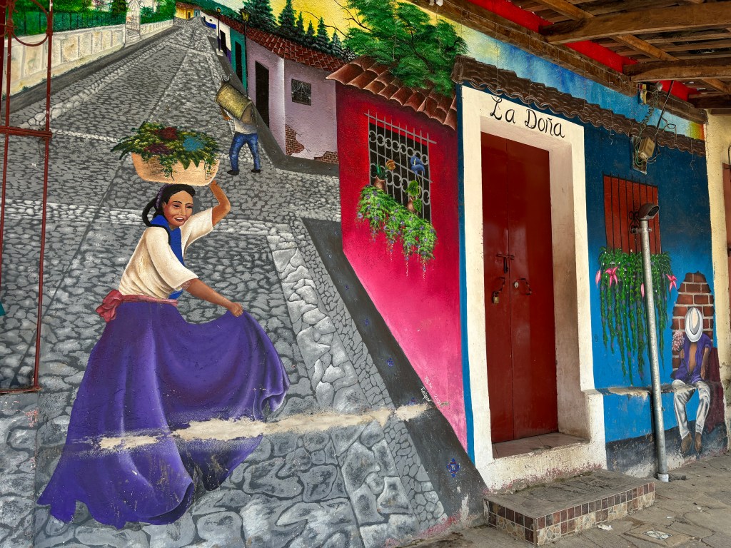 La primera parada, Concepción de Ataco, es uno de los pueblos más grandes de la Ruta de las Flores y para nosotros el más bonito. Con un centro histórico empedrado y lleno de arte callejero, con muchas de las fachadas pintadas y una plaza central super bonita, es un lugar perfecto para pasear, sacar miles de fotos y comprar algún recuerdo (si te cabe en la maleta, claro; a nosotros en la mochila, no).