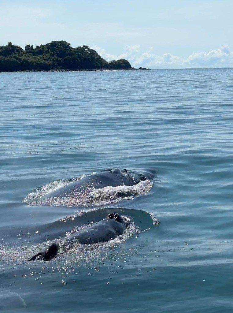 Parece ser que, como está recién nacida, todavía nadan las dos juntas tranquilamente por el golfo de Chiriquí. Una vez que se haga más mayor, empezará a nadar mucho más rápido, saldrá menos a respirar y empezará a dar saltos fuera del agua. Pero para nosotros, hoy, es una suerte haberlas encontrado y que podamos disfrutar de ellas unos 20 minutos tranquilamente.