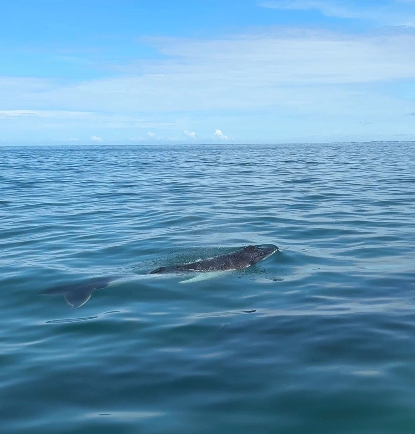 Pero… de repente Carlos ve una cría que emerge de nuevo del agua por delante nuestro muy muy cerquita de donde vamos a pasar y el patrón baja la velocidad para que la podamos ver nadar junto a su madre.
